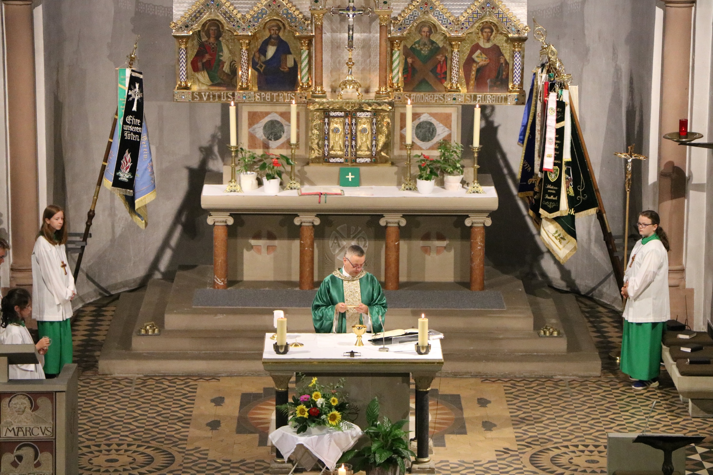 Auf Grund vorhergesagter Unwetter konnte der Gottesdienst leider nicht an dem traditionellen Ort, der Kriegergedächstniskapelle am Lufthof, stattfinden. Stattdessen zelebrierte Pfarrer Wieslaw Przygoda den Gottesdienst in der Kirche. Musikalisch umrahmt wurde der Gottesdienst durch die Schifferkapelle Frankonia.