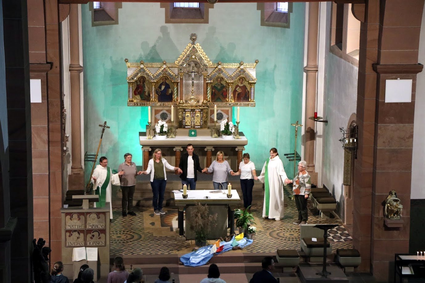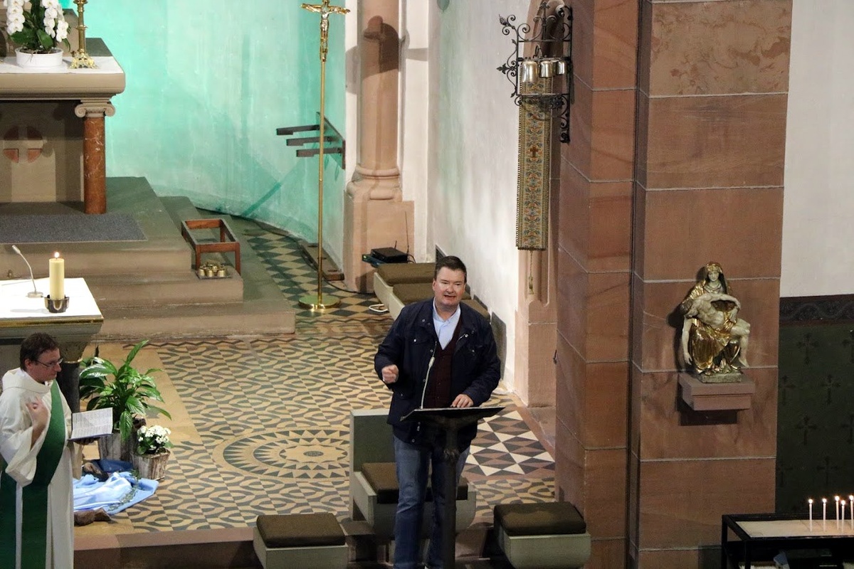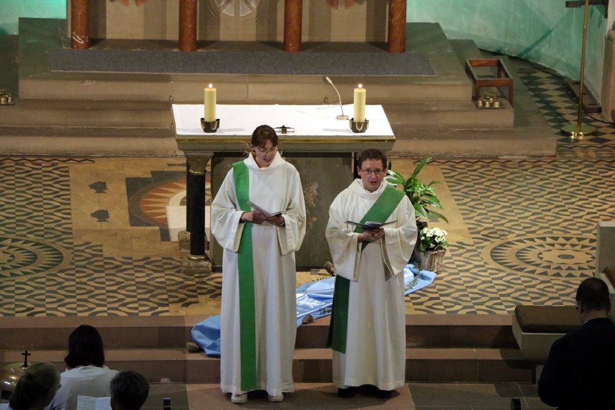 Nach einer Begrüßung durch den Moderator des Pastoralen Raumes, Pfarrer Jan Kölbel, standen Diakon Florian Grimm und die Koordinatorin des Pastoralen Raumes, Pastoralreferentin Marie-Bernadette Reichert, der Liturgie vor. In der Gestaltung gingen sie darauf ein, dass trotz manch großer geographischer Entfernung der einzelnen Orte im Pastoralen Raum der Main ein verbindendes Element sei. Das Wasser des Mains könne auch für die unterschiedlichen Lebens- und Glaubenswege der Menschen stehen und zeige, dass vieles in den Kirchengemeinden „im Fluss“ ist und man gemeinsam unterwegs sei.