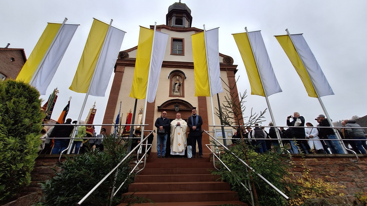 Nach 30 Jahren waren die alten Fahnen zerschlissen und so können die neuen Fahnen die Kirchenbesucher schon von Weitem begrüßen.