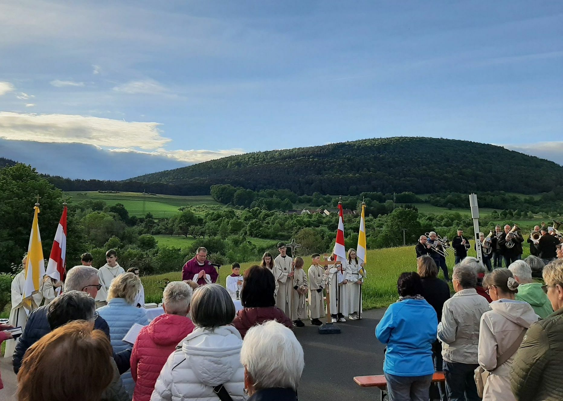 Mit Liedern und Gebeten machten sich zwei Gruppen - vom Friedhof in Breitenbrunn und dem Kindergarten in Faulbach - auf den Weg zur Dornhecke am Grohberg. Begleitet wurden sie von den Ministranten und den Musikkapellen aus Faulbach und Breitenbrunn, die so zum festlichen Rahmen der Bittprozession und der anschließenden Messfeier beitrugen, die Pfarrer Winter zelebrierte.