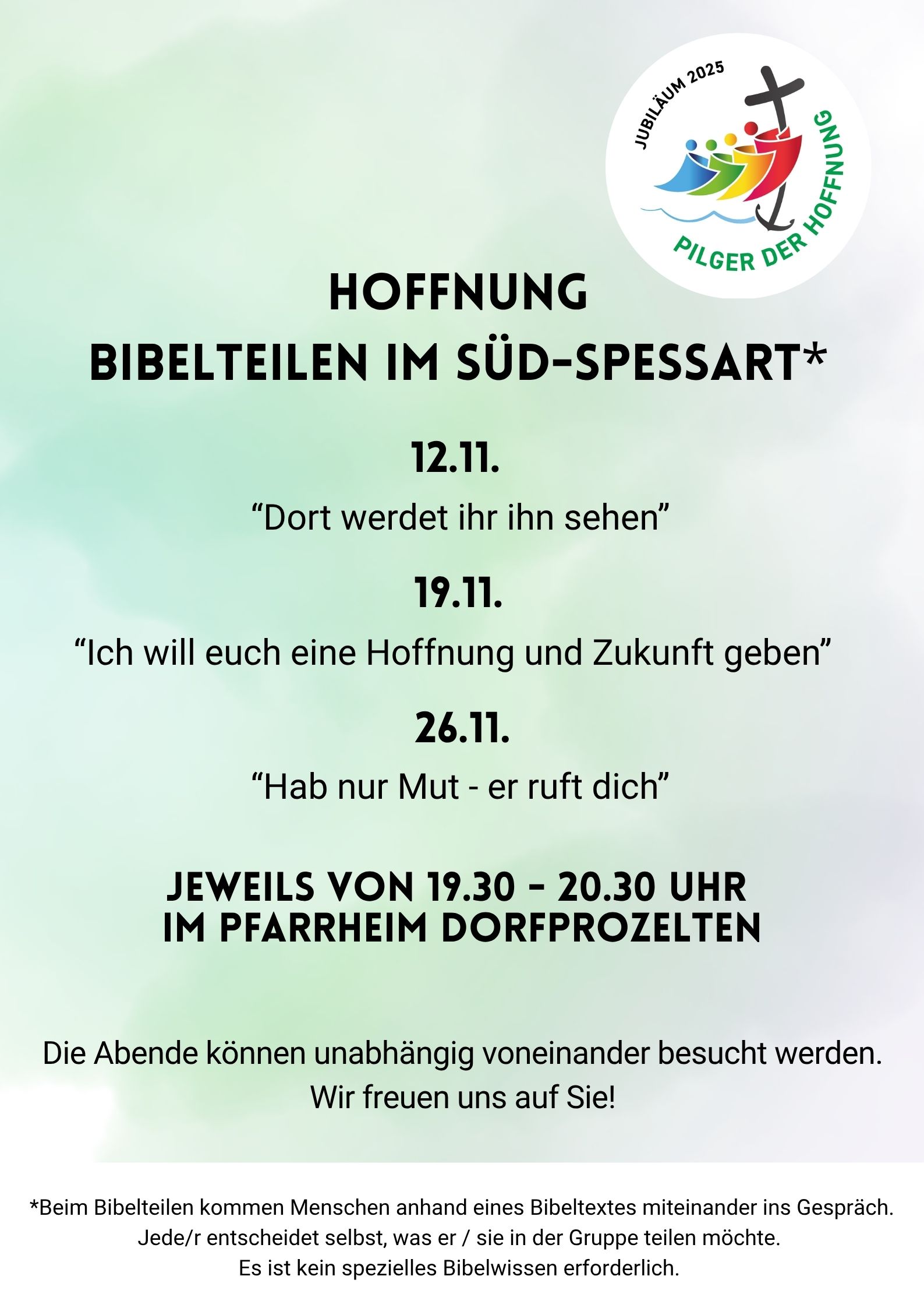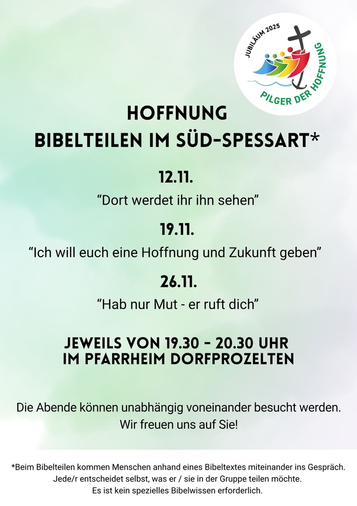 Beim Bibelteilen kommen Menschen ahand des Bibeltextes miteinander ins Gespräch. Jede/r entscheidet selbst, was er / sie in der Gruppe teilen möchte. Es ist kein spezielles Bibelwissen erforderlich.